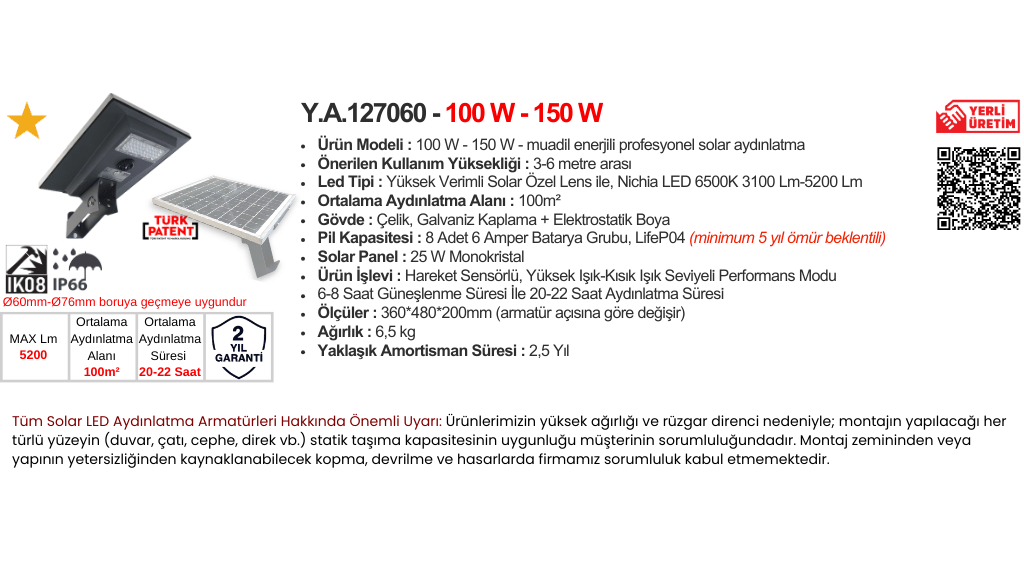 - Önerilen Ampul Gücü Muadil Enerji : Solar Led 100W - 150W watt