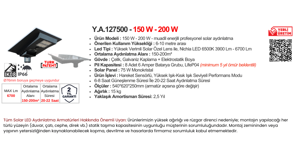 - LED Gücü Muadil Enerji :Solar Led 150w-200 watt