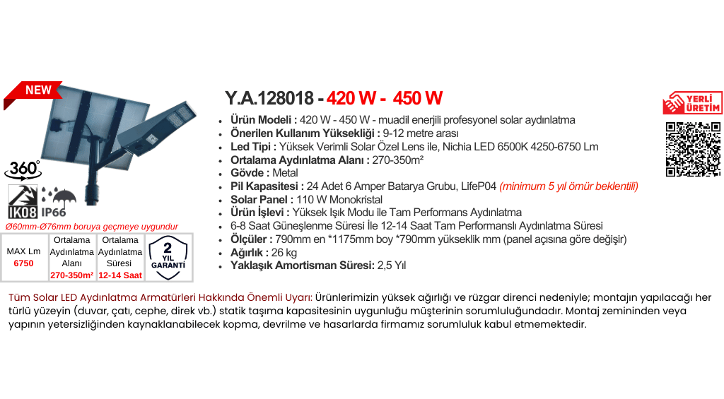 YKN Green Power 420w-450w Solar Aydınlatma Güneş Enerjili Sokak Lambası