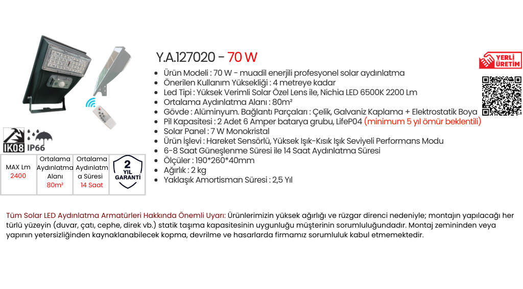 - Önerilen Ampul Gücü Muadil Enerji : 70W Solar Led watt